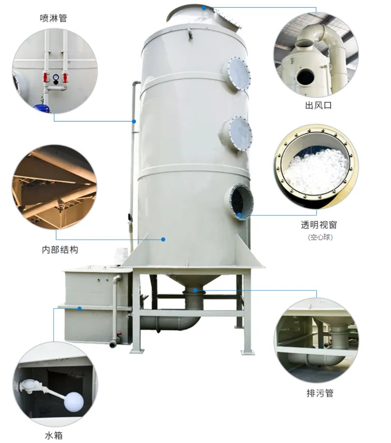 喷淋塔设备主要是由进气口,出气口、检修口、塔体(吸收塔)、填料层、喷淋层、药液储存投加系统、循环水箱等零件组成,吸收塔是整个喷淋塔的吸收核心。工业废气从吸收塔进入,在喷淋层与填料(根据不同的废气成分配置)发生化学反应,可去除废气中含有的有毒有害的废气,经过一级净化后的气体送达碳纤维进行吸附,最后达标排放于大气层中。