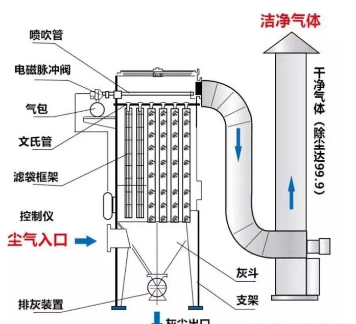 含尘气体由风机通过吸尘管吸入箱体,进入滤袋过滤,粉尘颗粒被滤袋阻留在表面,经过过滤的净化气体由出风口排出,可直接排放在室内循环使用,也可根据需要排出室外。整个除尘过滤是一个重力,惯性力,碰撞,静电吸附,筛滤等综合效应的结果。除尘器连续工作一段时间后,滤袋表面的粉尘不断增加,继而进行清灰,粉尘抖落在集尘器(抽屉)中,再由人工进行处理 。